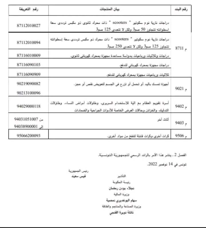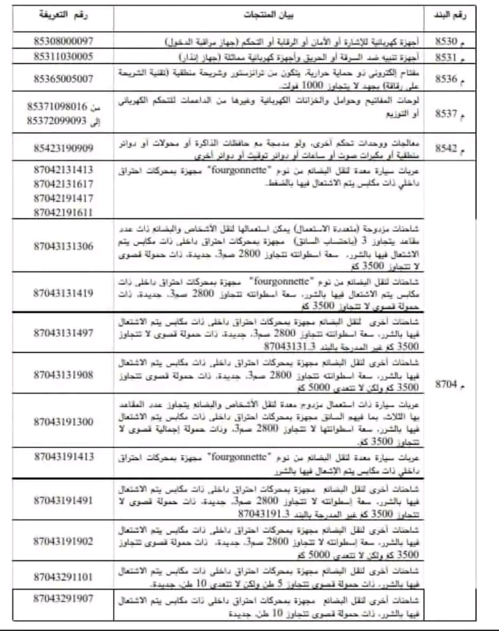 حيث نص الأمر المذكور على اعفاء المنتجات الآتي ذكرها والتي ليس لها مثيل مصنّع محليا من دفع المعاليم الديوانية من أبرزها #الشاحنات ذات #الاستعمالالمهني والتي لا يزيد مقاعدها على ثلاثة باحتساب #السائق #والدراجاتالنارية التي لا تزيد سعة اسطوانتها عن 124 سم مكعب وأجهزة #التسجيل وبعض #المعدات_الطبية وفيما يلي القائمة الكاملة: