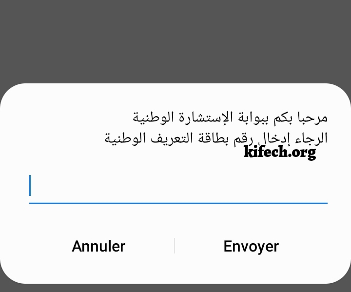 بعد ادخال رقم بطاقة التعريف الوطنية تصلك رسالة فيها الكود السري كما في الصورة التالية و تجدر الاشارة انه يجب ان تكون الشريحة او بطاقة سيم التي تستعملها للتسجيل في الاستشارة هي مسجلة باسمك.