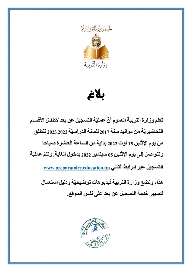 تعلم وزارة التربية ان عملية التسجيل عن بعد للاطفال اقسام التحضيرية من مواليد 2017 للسنة الدراسية 2022 2023 ينطلق يوم الاثنين 15 اوت بداية من الساعة 10 صباحا. و يمتد التسجيل في التحضيري عن بعد الى غاية يوم الاثنين 5 سبتمبر 2022 . و يمكن التسجيل من الموقع التالي: