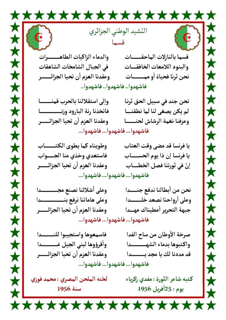 إن في ثــورتنا فصل الـخطاب ** وعقدنا العزم أن تـحيا الجزائر