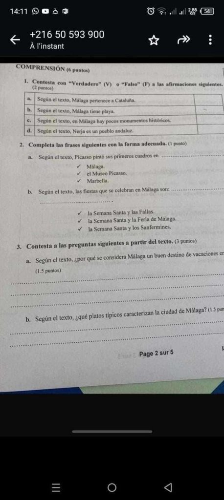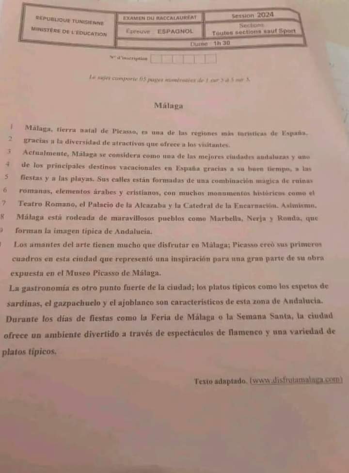 في يوم الأربعاء 5 جوان 2024، خضع طلاب البكالوريا في تونس لامتحان اللغة الإسبانية كمادة اختيارية. الامتحان تضمن نصًا حول مدينة مالقة الإسبانية، مما يعكس تركيز الامتحان على الثقافة والتاريخ الإسبانيين.