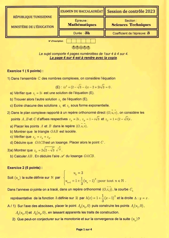 إليكم امتحان بكالوريا 2023 رياضيات باك تقنية دورة المراقبة في تونس.
