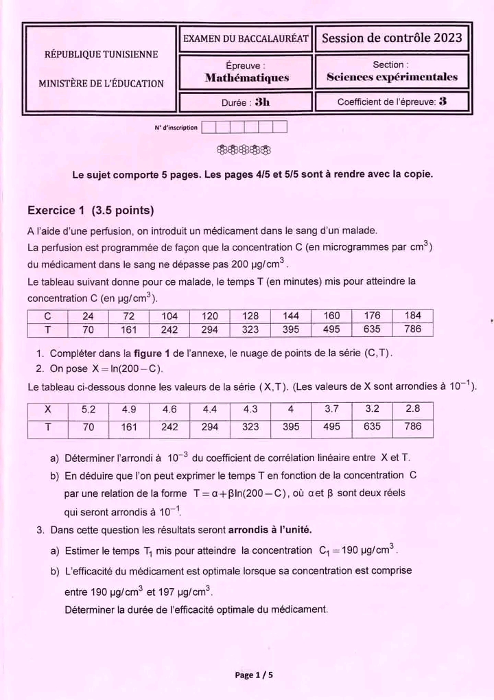 إليكم امتحان بكالوريا 2023 رياضيات باك علوم تجريبية دورة المراقبة في تونس.