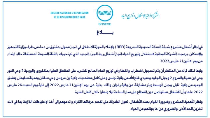 sonede tunisie coupure d eau 2022 أو انقطاع الماء الصالح للشراب من طرف الشركة التونسية لاستغلال و توزيع المياه الصوناد sonede.إذ في إطار اشغال شبكة السكة الحديدية rfr و لادخال الحوزة لانطلاق في انجاز محول بمفترق بن دحة من طرف وزارة التجهيز و الاسكان فقد برمجت شركة sonede انجاز اشغال ربط الجزء الجديد الذي تم تحويله بالقناة القديمة المستغلة حاليا ابتداء من يوم الاثنين 2021.